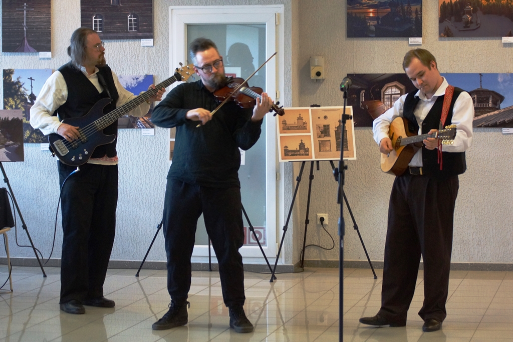 Водлозерье – не только заповедная природа, но и широкий пласт самобытной культуры. Среди лесных пейзажей и сцен из жизни лесных обитателей звучала прекрасная музыка. Частичкой песенного наследия водлозёров поделилась с гостями вернисажа научный сотрудник Парка Полина Шулепова. Она исполнила озорные частушки, собранные в экспедициях более 30 лет назад. Музыкальный подарок приготовили давние друзья заповедной территории – Ансамбль народной музыки Toive Петрозаводского государственного университета. Почти 40 лет ансамбль радует слушателей своим искусством и каждый год проводит «водлозерские каникулы» на территории Парка. Другой известный коллектив – деревенский оркестр «Гудари» порадовал гостей вернисажа душевным звучанием народных инструментов.