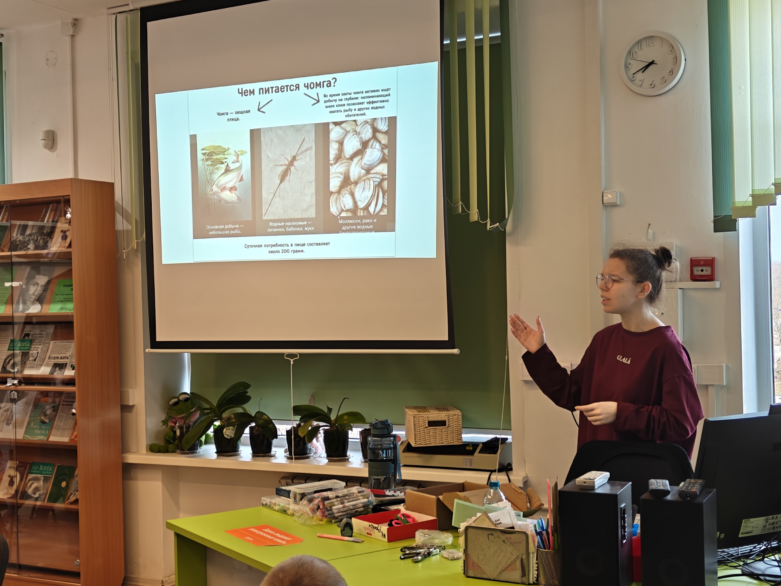 Для младших классов прошёл интерактивный урок, посвящённый птице 2026 года — чомге. Ребята узнали особенности внешнего вида, среды обитания и образа жизни этой водоплавающей птицы. Отдельное внимание уделили причинам выбора чомги птицей года: в 2024 году в результате разлива нефти в Керченском проливе этот вид пострадал больше других. Завершилась встреча мастер-классом «Птица из открытки» — школьники создали подвижные игрушки из вторичных материалов.