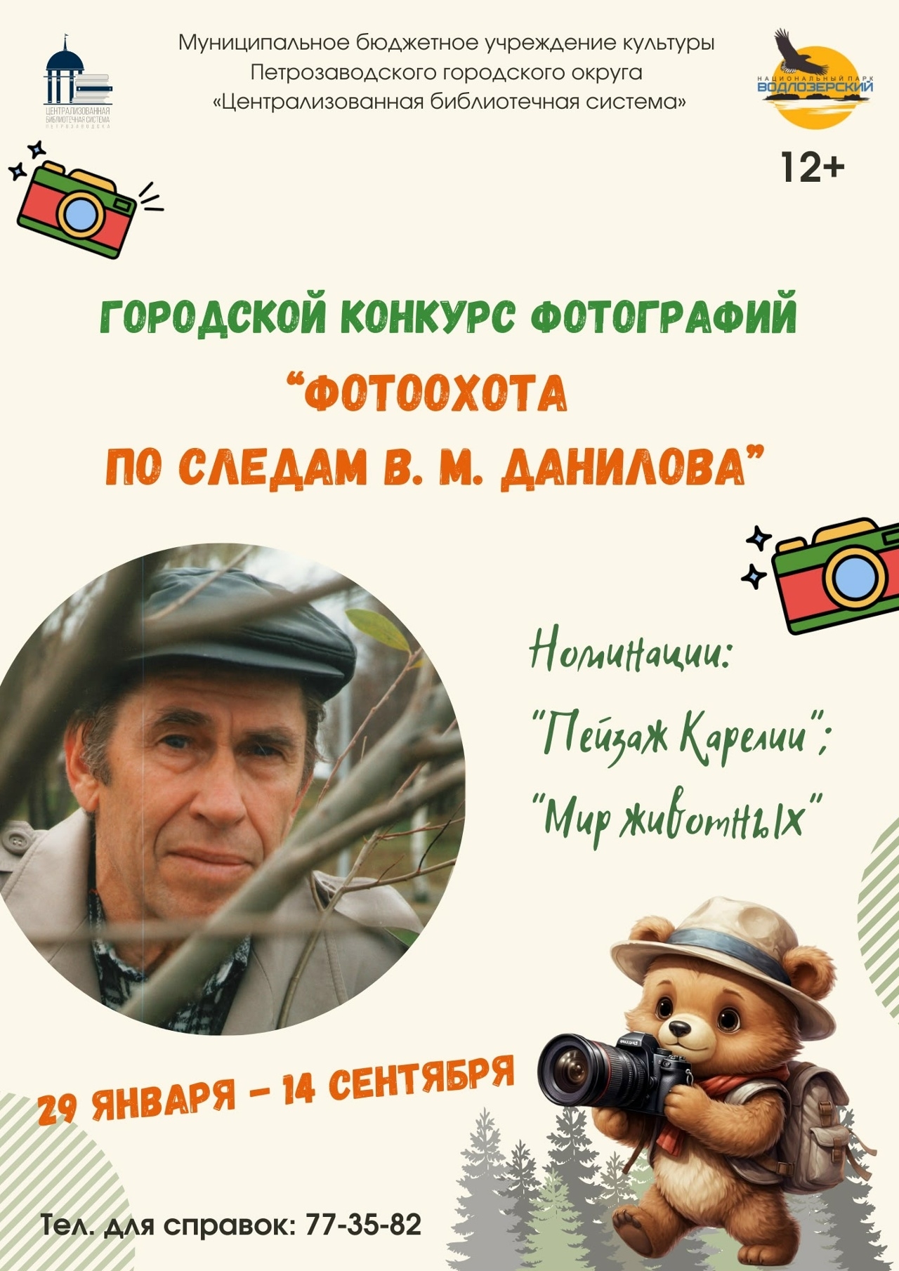 В 2026 году исполняется 95 лет со дня рождения известного карельского писателя-натуралиста Владимира Михайловича Данилова. В честь этой даты Петрозаводская централизованная библиотечная система и Национальный парк «Водлозерский» объединились, чтобы провести городской конкурс фотографий «Фотоохота по следам В. М. Данилова».