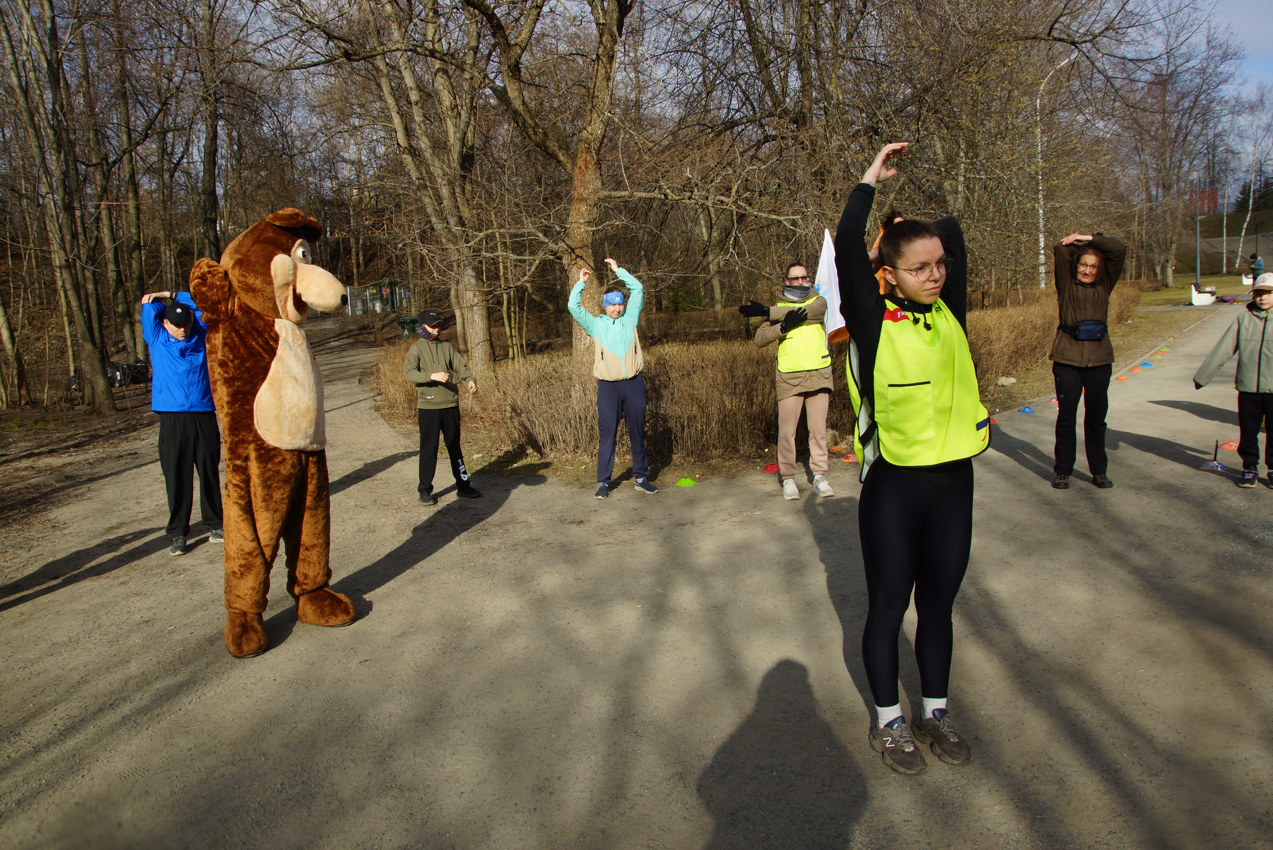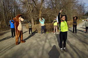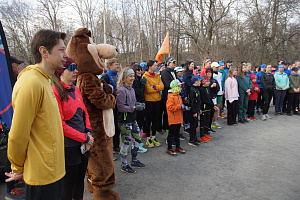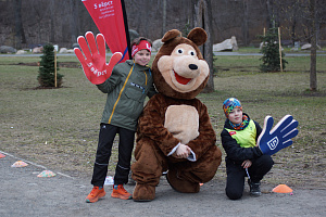 Начался забег с бодрой разминки от сотрудника парка Олеси Кушниковой. А вместе с участниками зарядку делал… бурый медведь! Настоящий обитатель дикой тайги (пусть и в костюме) вызвал бурю эмоций и у детворы, и у взрослых.