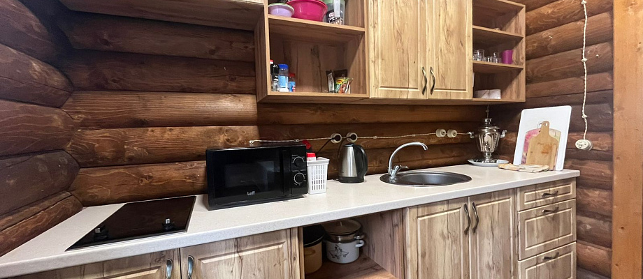 Четырехместная комната в бревенчатом доме с террасой и видом на залив Реболахта. В доме четыре комнаты, электричество, водопровод, просторный холл с панорамными окнами и барбекю, есть обеденная зона – столы и табуреты, небольшая кухня с плитой и двумя холодильниками, а также сауна. Туалеты находится с торца здания.