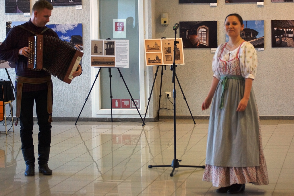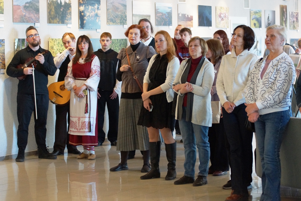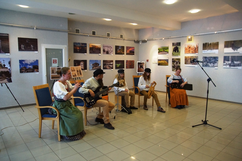 Водлозерье – не только заповедная природа, но и широкий пласт самобытной культуры. Среди лесных пейзажей и сцен из жизни лесных обитателей звучала прекрасная музыка. Частичкой песенного наследия водлозёров поделилась с гостями вернисажа научный сотрудник Парка Полина Шулепова. Она исполнила озорные частушки, собранные в экспедициях более 30 лет назад. Музыкальный подарок приготовили давние друзья заповедной территории – Ансамбль народной музыки Toive Петрозаводского государственного университета. Почти 40 лет ансамбль радует слушателей своим искусством и каждый год проводит «водлозерские каникулы» на территории Парка. Другой известный коллектив – деревенский оркестр «Гудари» порадовал гостей вернисажа душевным звучанием народных инструментов.