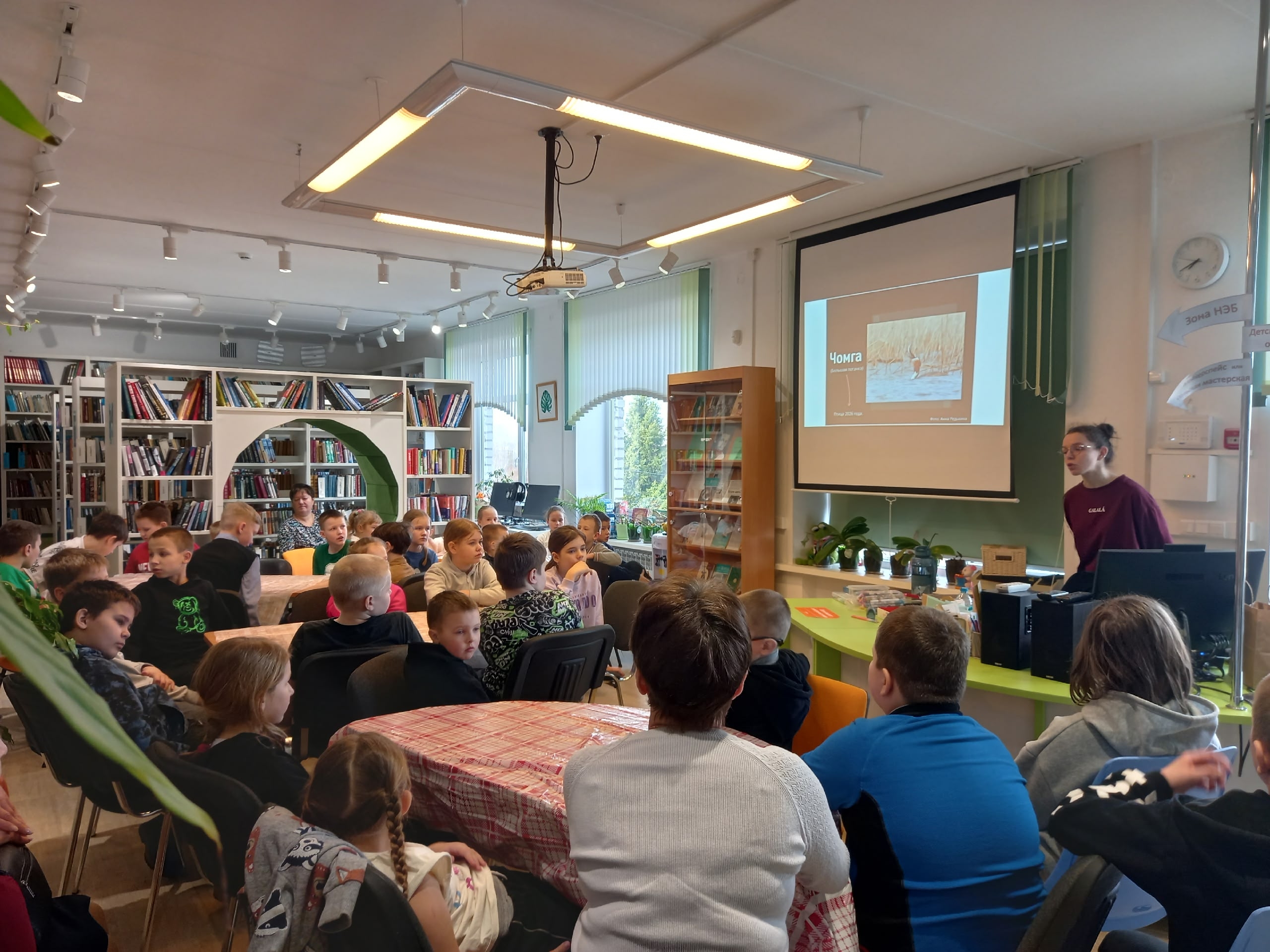 Для младших классов прошёл интерактивный урок, посвящённый птице 2026 года — чомге. Ребята узнали особенности внешнего вида, среды обитания и образа жизни этой водоплавающей птицы. Отдельное внимание уделили причинам выбора чомги птицей года: в 2024 году в результате разлива нефти в Керченском проливе этот вид пострадал больше других. Завершилась встреча мастер-классом «Птица из открытки» — школьники создали подвижные игрушки из вторичных материалов.