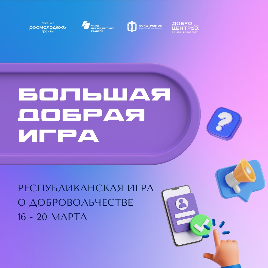 С 16 по 20 марта по всей республике проходила Республиканская социальная акция «Большая добрая игра». Участники — начинающие и опытные волонтёры из разных районов Карелии — пробовали себя в добровольчестве, знакомились с сервисами Добро.рф и выполняли добрые дела в самых разных сферах. Всего в игре приняли участие около 350 человек.
